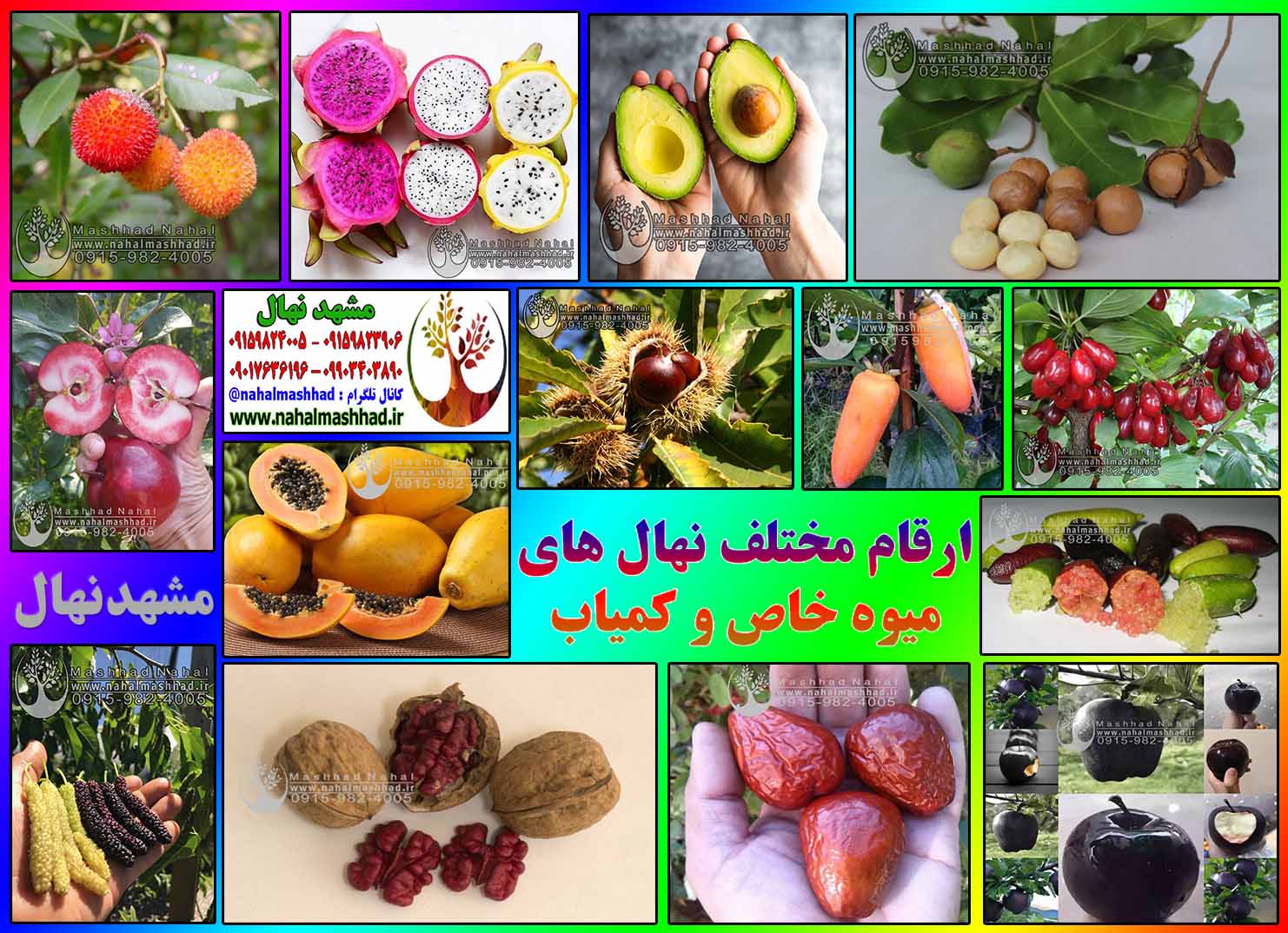 - ارقام مختلف نهال های میوه خاص و کمیاب : آربوتوس یا آربوزیا(توت فرنگی درختی) – انار پوست سیاه – آناناس – موز کاوندیش – انبه – آووکادو – پاپایا(خربزه درختی) – پاوپاو(انبه سردسیری) – پشن فروت – توت سرامیکی – توت موزی – خرمالو مانگو(موزی) – دراگون فروت – زردالو پرتقالی – زغال اخته کانادایی – سیب توسرخ – سیب سیاه(جرومین) – شاه بلوط ترکیه – قهوه عربیکا – گلابی ناشی(پرتقالی) – گلابی ردآنجو – گیلاس سورینام (گرمسیری) – لایمکوات – کامکوات – لیمو خاویاری استرالیایی (لیمو انگشتی) – ماکادمیا(فندق استرالیایی)
